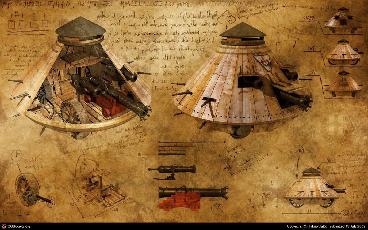 Leonardo Da Vinci's Machines of War. Leonardo's voracious design imagination created the following impossible inventions: the Scythed Chariot, The Giant Crossbow, and the treadmill machine-gun. But he also invented - 400 years ahead of his time - shrapnel and the tank.pic.twitter.com/tO62lT29yk