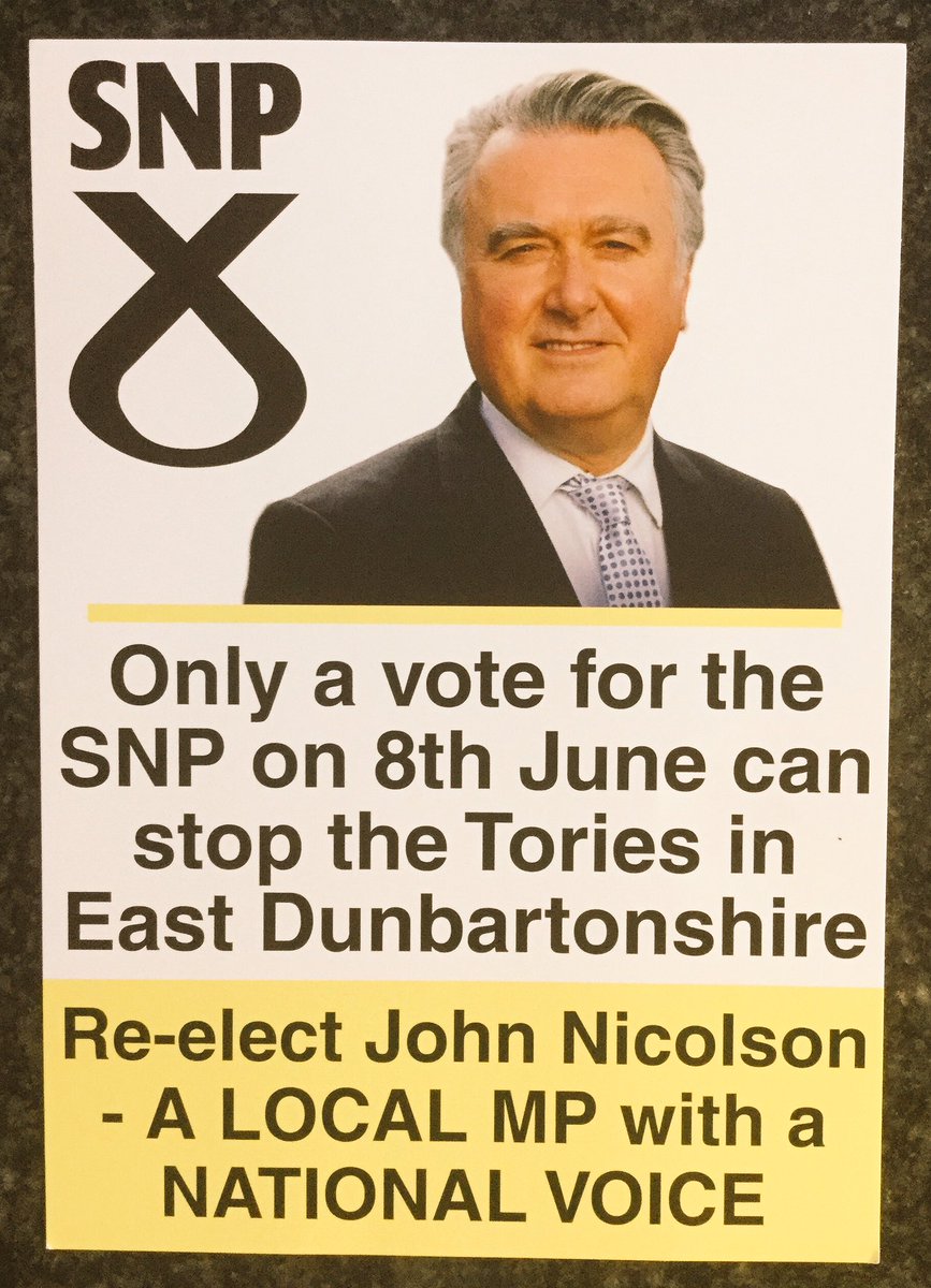 Only a #votesnp can stop a Tory MP being elected here tomorrow. Going through letterboxes all across East Dunbartonshire tonight. #ge17pic.twitter.com/O1anQ1yPIh