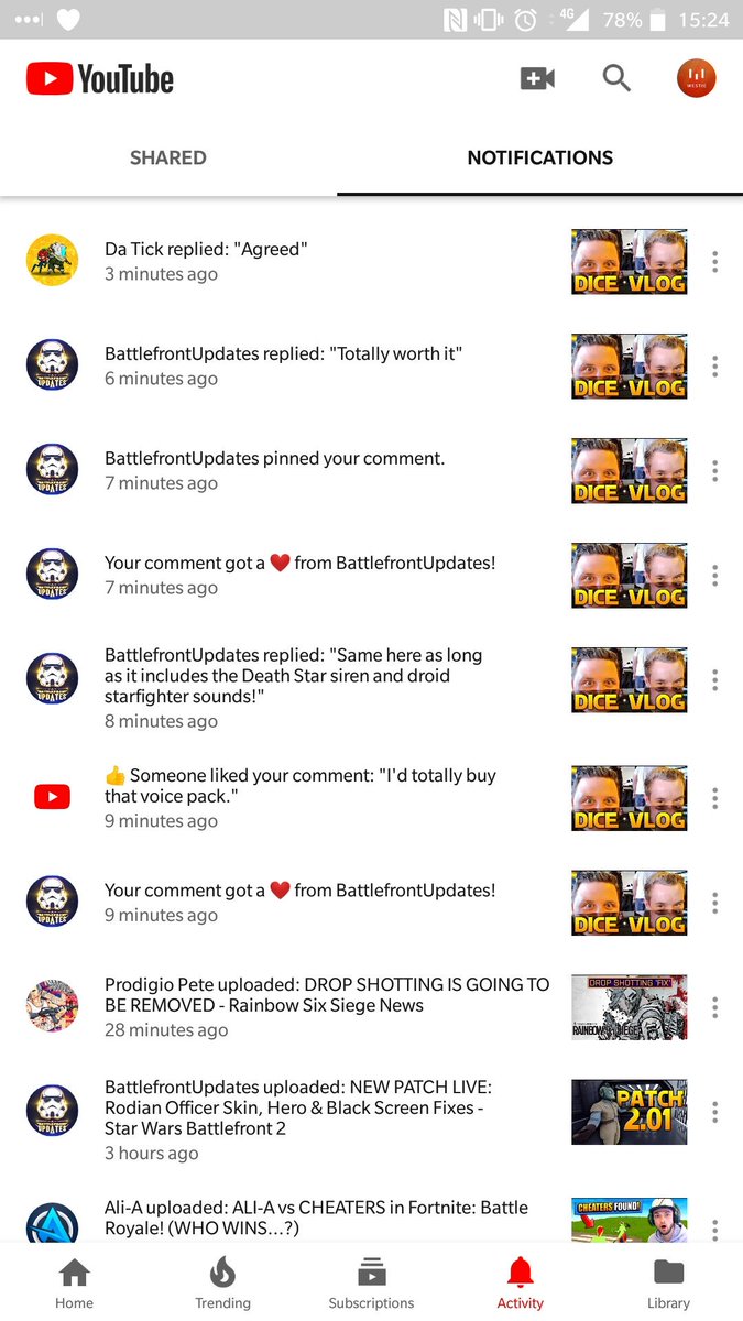 Here's the notifications list on mobile. No VLOG video from @SWBFUpdates in there BUT there are entries of actions on a comment I left on the video. I did get a notification for his Patch 2.01 video earlier though. W.T.F. C'mon YouTube, sort it out!!!!!!pic.twitter.com/5Recqw9EkG