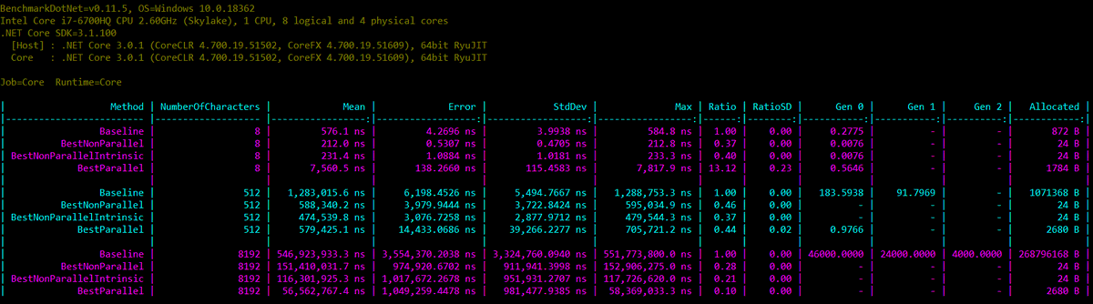Finally got around to tuning my intrinsic version of my Levenshtein Distance calculator which finally out performs my non-intrinsic version. That makes my intrinsic version the fastest "correct" implementation I've built as my parallel one has various race condition problems.pic.twitter.com/1krOWfFHVC