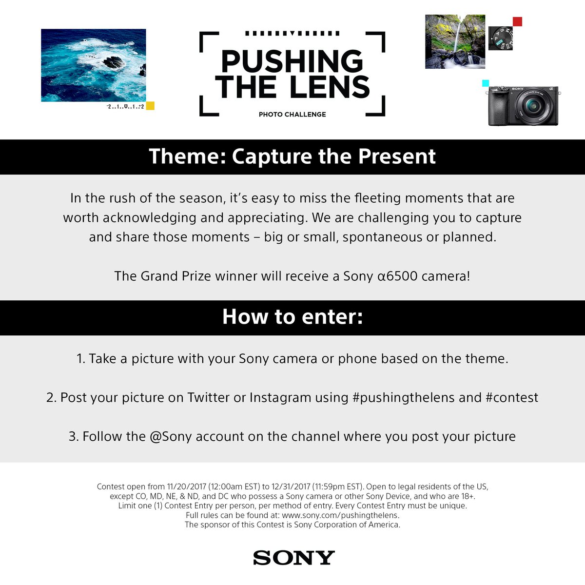 The next Pushing the Lens challenge is now live. Submit your photos & win Sony gear. The new theme is "Capture the Present." Swipe through the images to see how to enter. For more information & full rules: http://www.sony.com/pushingthelens/  #pushingthelens pic.twitter.com/1PfYcton2I