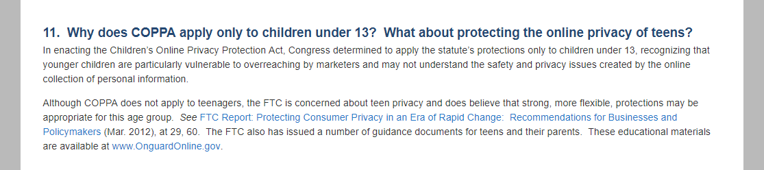 "FTC can pursue regulatory action against you." Well I understand that just fine. So I guess I need to read FTC COPPA regulations. Can some one with a brain help me out here?