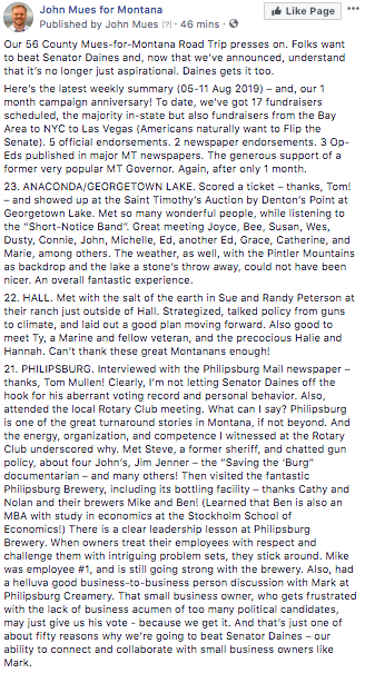 Our 56 County Mues-for-Montana Road Trip presses on. Folks want to beat Senator Daines and, now that we’ve announced, understand that it’s no longer just aspirational. Daines gets it too. Here’s the latest weekly summary (05-11 Aug 2019) – and, our 1 month campaign anniversary!pic.twitter.com/ZV99mdKZGj