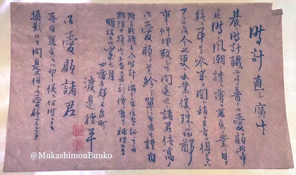 (承前) 付言賤職手入の時計は満一ヶ年の保存を証し候に付 期限中振り止り等有之節は別に価を要せつ補理仕候 明治廿四年七月 [新潟県]中蒲原郡五泉町 渡邉徳平 (印) 御愛顧諸君 再白写真も御望に従ひ何時にても 撮影仕候間是又併て御愛顧あらんことをpic.twitter.com/dXGzosFiiG