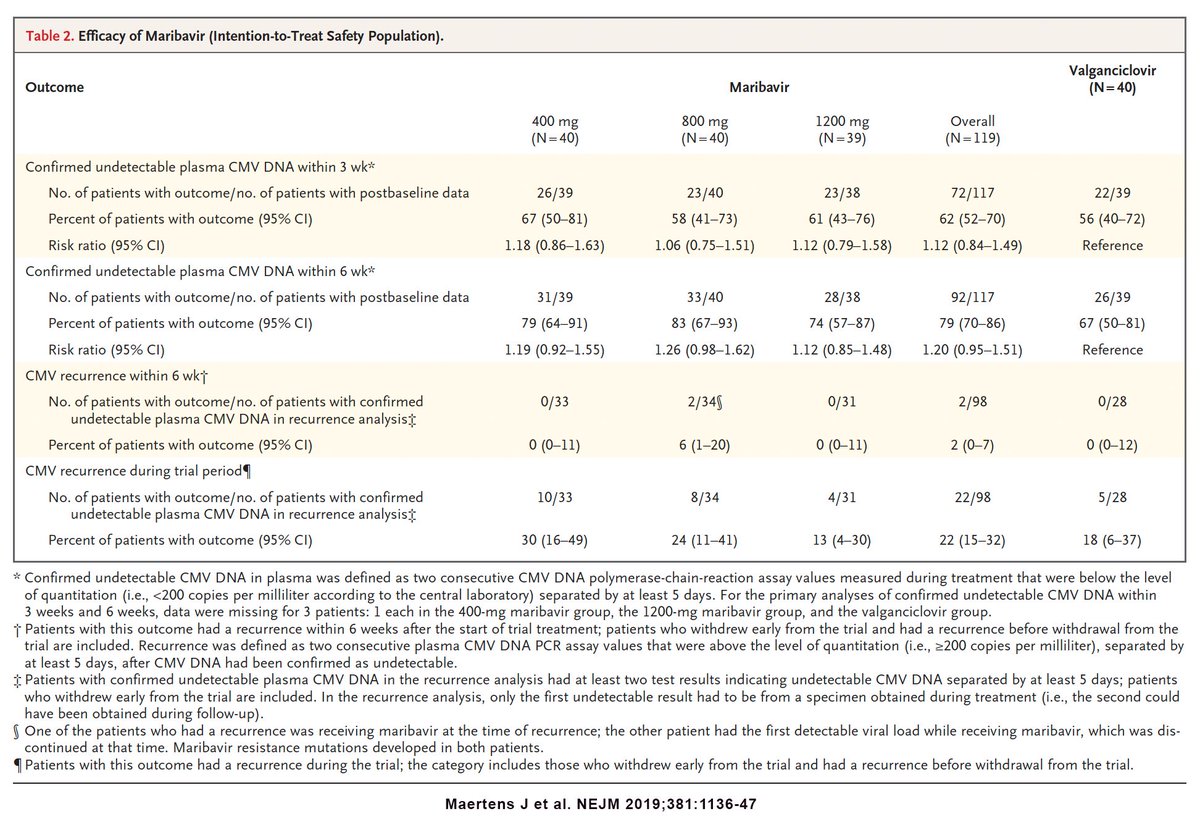 #Maribavir dose 400 to 1200mg vs.#valganciclovir 900mg BID for#cytomegalovirus preemption in#transplant patients: https://www.nejm.org/doi/full/10.1056/NEJMoa1714656#.XYKbDB6vjwM.twitter … Compare to US trial for refractory/resistant#CMV infection published in CID: https://academic.oup.com/cid/article/68/8/1255/5133438#.XYKacskoPeg.twitter …#TxIDpic.twitter.com/Si0wUlBs1e