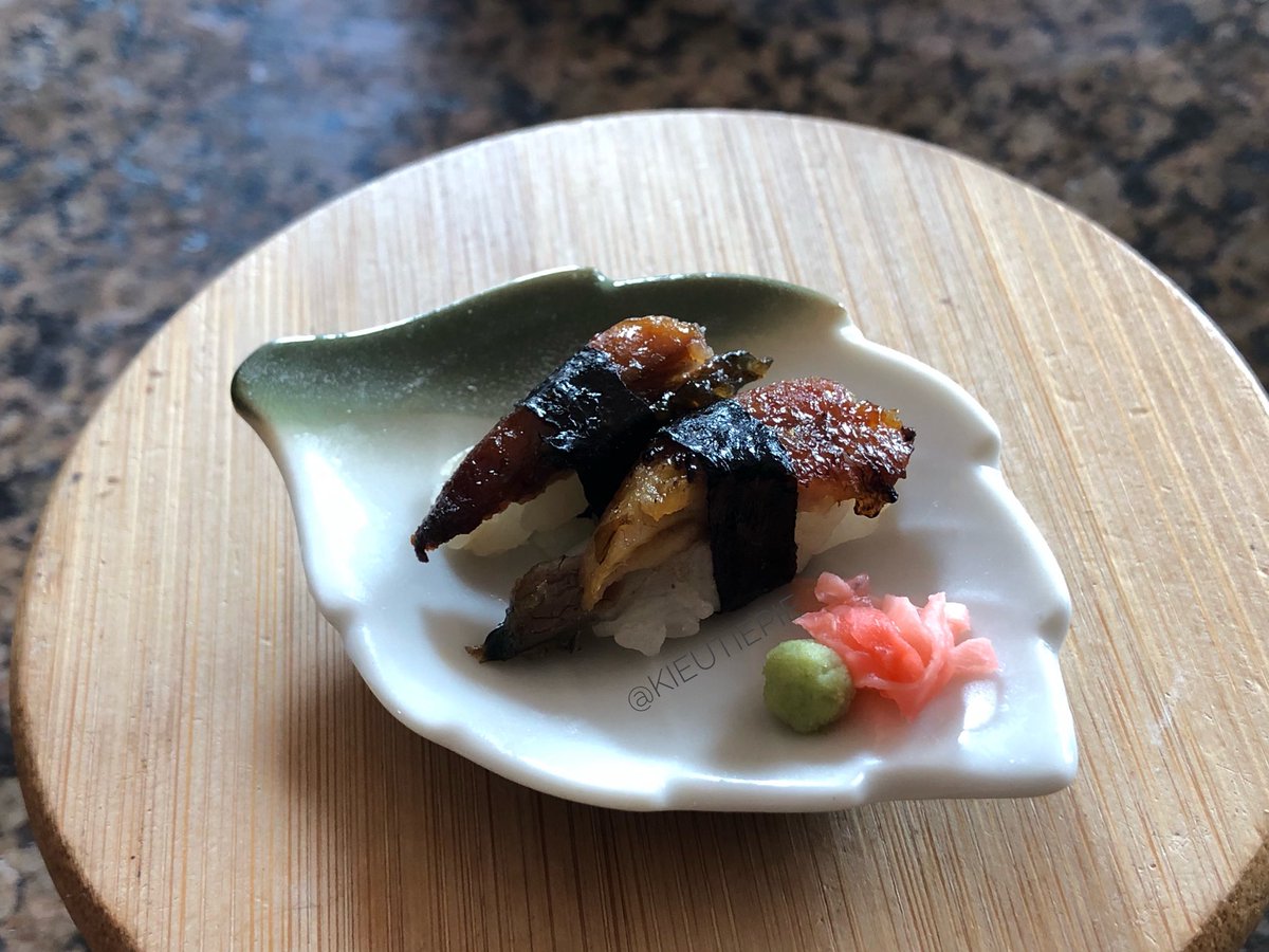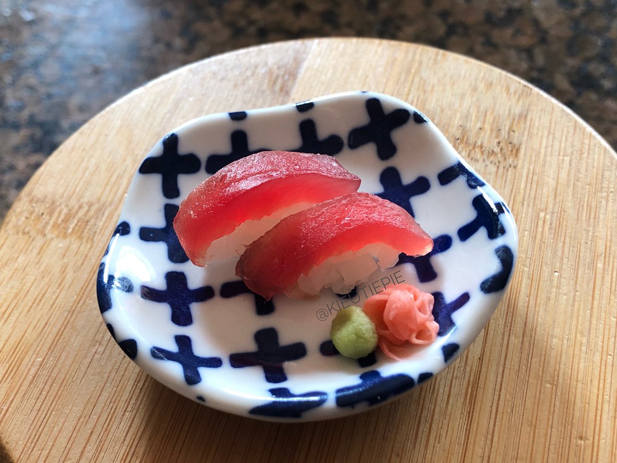At this size the main challenges were slicing the fish thinly enough without it breaking apart, and shaping the rice. Losing a single grain would throw off the size/shape and it kept sticking to my fingers. I tore the ginger by hand to keep the edges rough/organic.pic.twitter.com/d90MP4KYEV