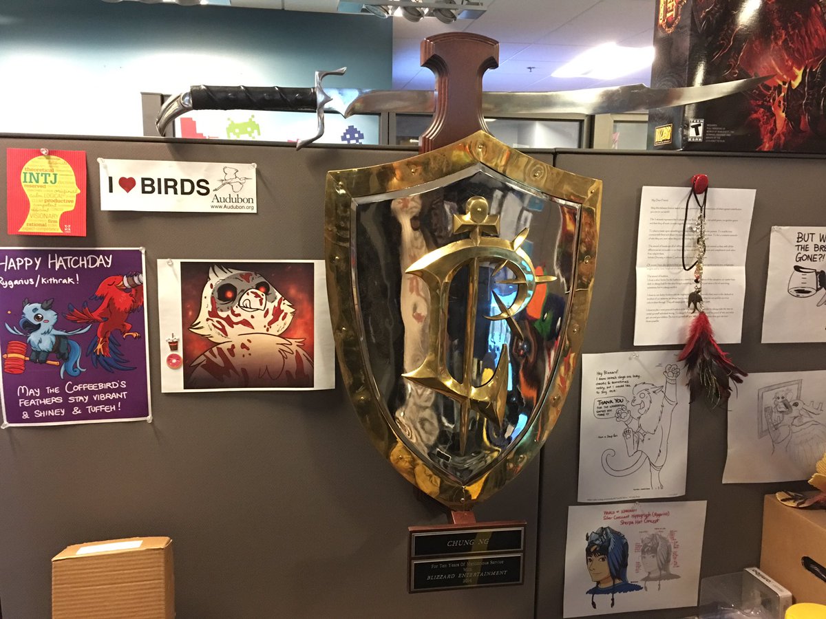 Got the shield and sword mount set up at my cube! Woot, so shiny. #CoffeeBird likes shiny. *chairspins* #BlizzLifepic.twitter.com/JGuNMzgkqO – w: Blizzard Entertainment HQ