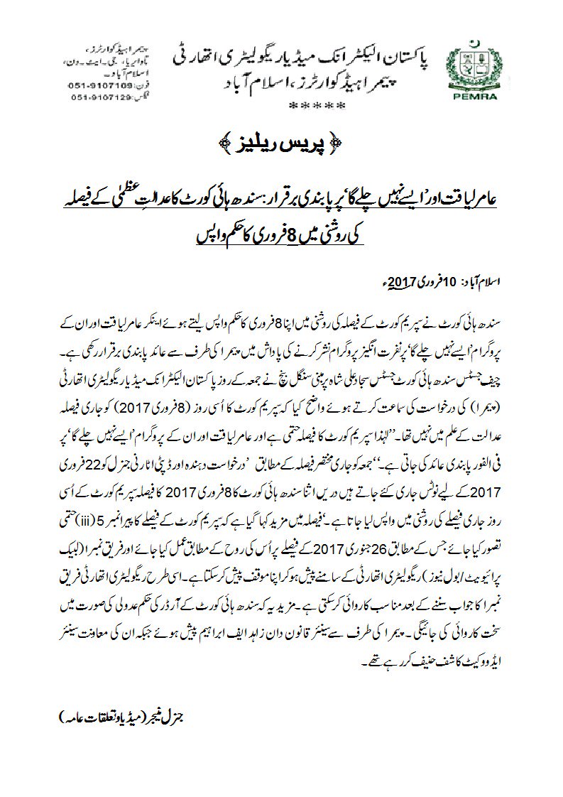 عامر لیاقت اور 'ایسے نہیں چلے گا' پر پابندی برقرار : سندھ ہائی کورٹ کا عدالتِ عظمٰی کے فیصلہ کی روشنی میں 8 فروری کا حکم واپسpic.twitter.com/nz7M5uBmbW