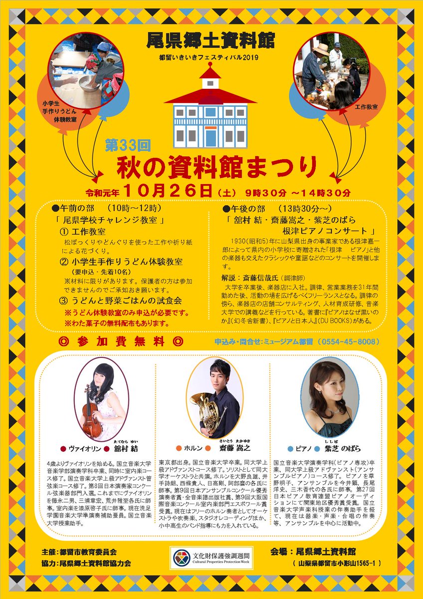 午後1時30分よりは昭和5年に山梨県出身の事業、根津嘉一郎によって寄贈された「根津ピアノ」と他の楽器も交えてなつかしい唱歌を演奏する「舘村結・斎藤嵩之・紫芝のばら 根津ピアノコンサート」を開催します。参加費は無料。皆さまご参加お待ちしております!https://www.city.tsuru.yamanashi.jp/shimin/shougaisupo/shogaigakushu/10358.html …pic.twitter.com/WXaWo7BPwy