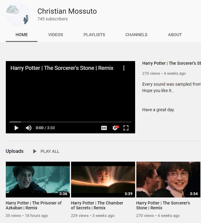 I found a channel that stole a quarter of my views from my Harry Potter remixes. I know YouTube isn't my main revenue and that I'm just doing this for fun, but these videos took months to make and they even cut out credits of people who helped me make them. Absolutely disgusting.pic.twitter.com/LFohvzRGHc