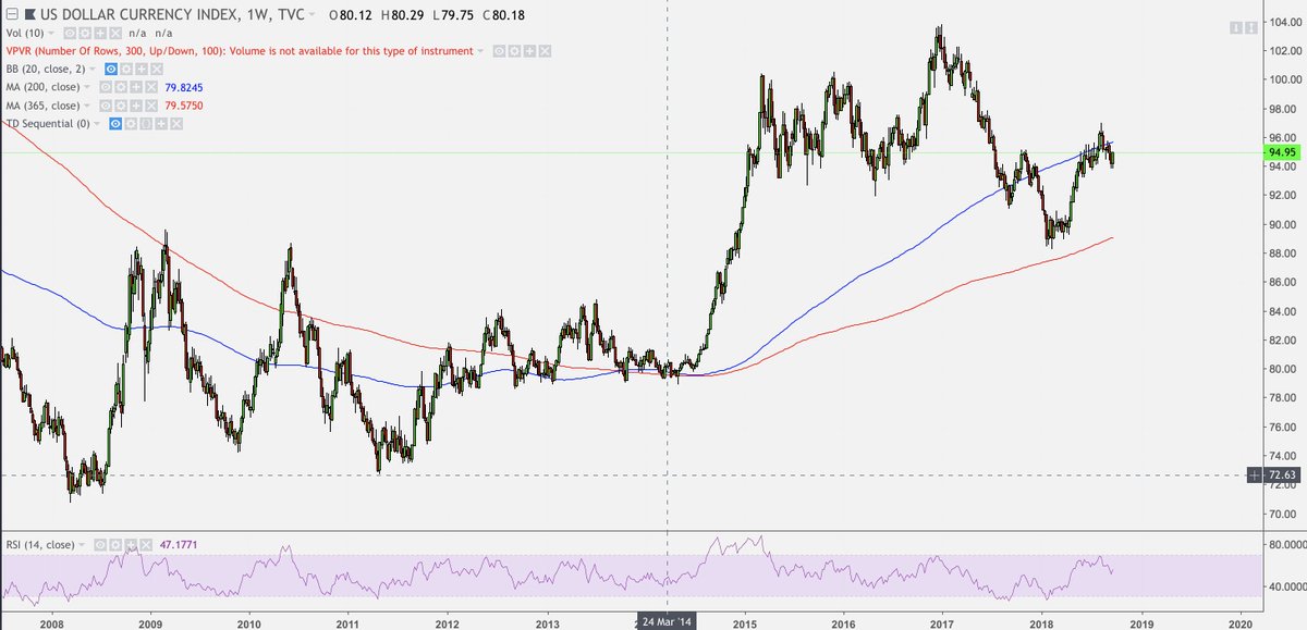 9. Shorts still very elevated historically rel to longs, oversold 10. Btc is small, any move to safe havens from trade wars is massively bullish 11. Interest rates going up is bearish fiat, debt service 12. Dollar index is weak 13. Bakkt is huge for such a small market as btc