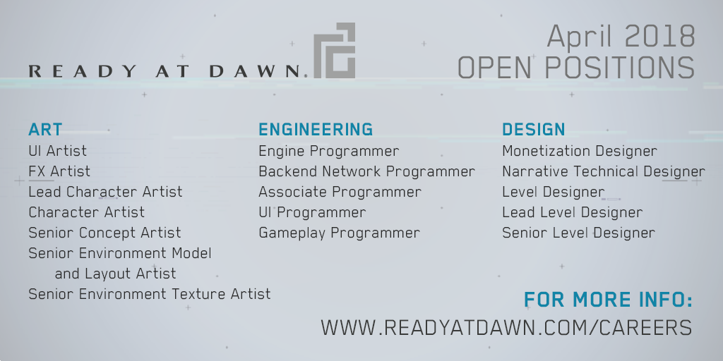 #RADJobs are here! We're seeking talented/passionate people to push the boundaries of tech, gameplay, art, & storytelling in game development. Check out our openings for April below and learn more at http://www.readyatdawn.com/careers . Let’s make something 𝐫𝐚𝐝 together!#GameJobspic.twitter.com/uuEWhb69mD