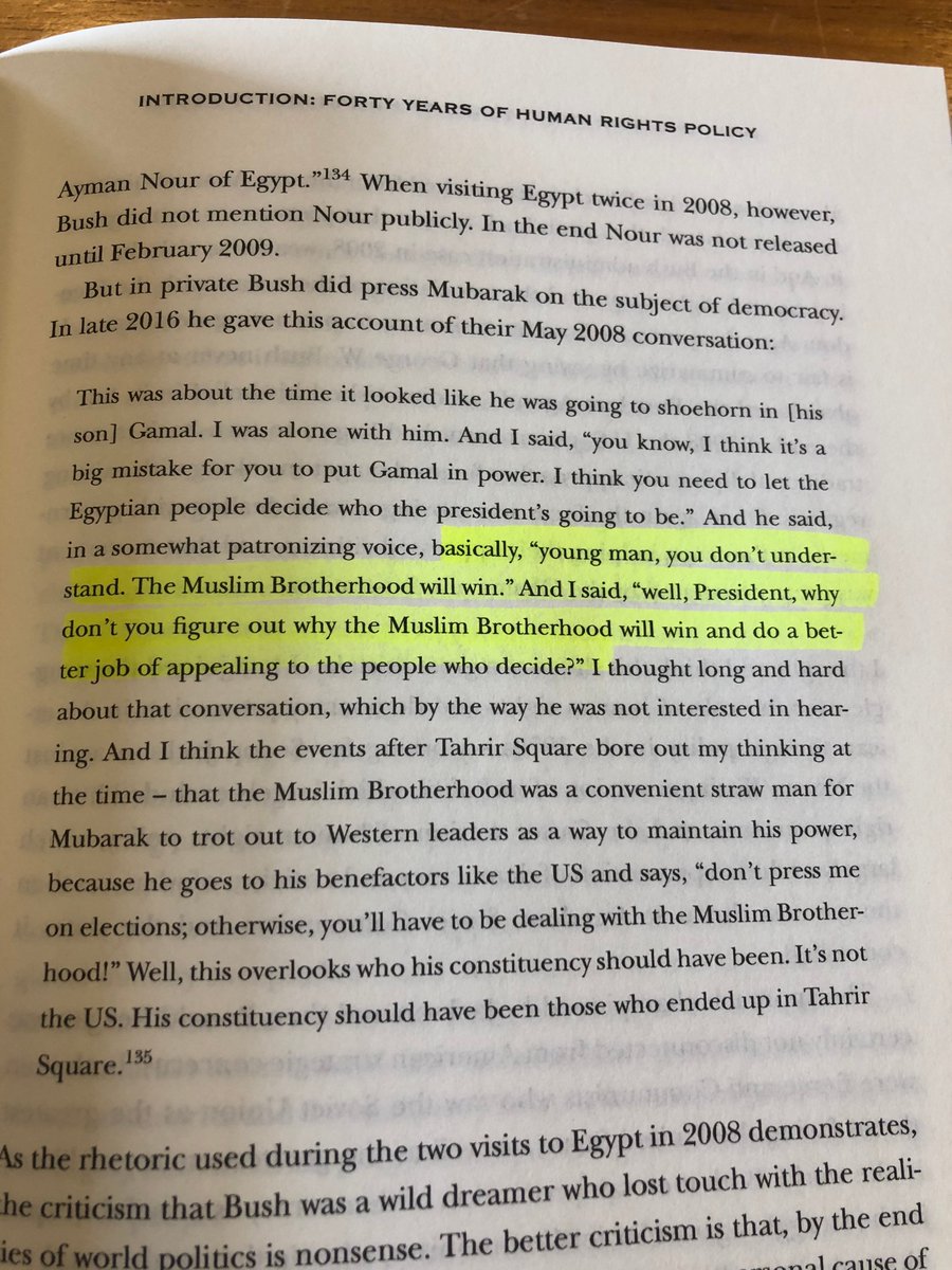 When George W. Bush brought up the need to hold elections, Mubarak told him in 2008, basically: "Young man, you don't understand. The Muslim Brotherhood will win." Bush actually had a pretty good a response https://www.amazon.com/Realism-Democracy-American-Foreign-Policy/dp/1108415628/ref=as_li_ss_tl?ie=UTF8&linkCode=ll1&tag=shtwitter-20&linkId=4c603764336dcff74c6663ff9a4c153a&language=en_US …pic.twitter.com/xFPFDWNd0v