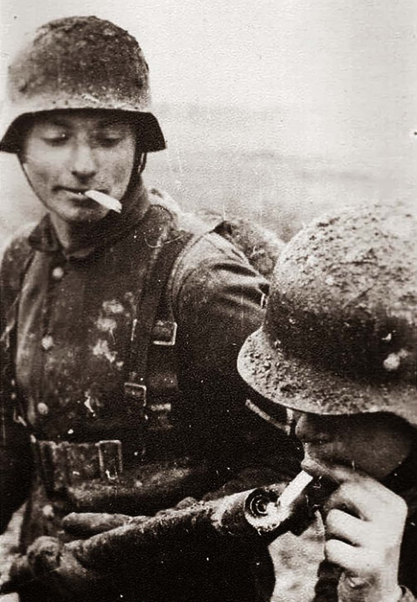 German soldier lights his homie's cigarette with the ignition system of his Wechselapparat ('Wex') flamethrower. The Wex was the final evolution of German flamethrower design and could be operated by a single man. Previous models required either a two man team or were immobile.pic.twitter.com/SOd4WgDBku