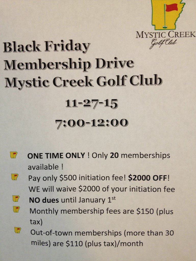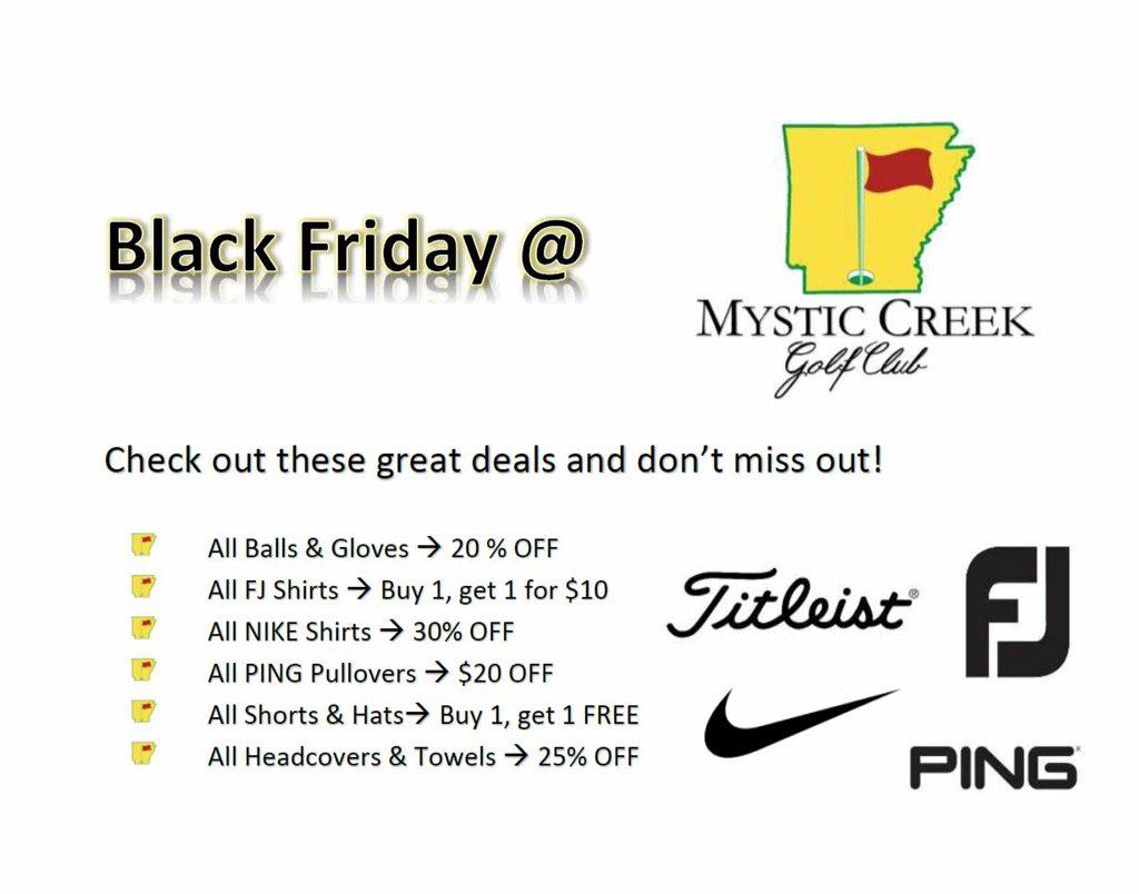 Black Friday at Mystic Creek Golf Club! Don't miss out on these great deals!!! Come see us on November 27thpic.twitter.com/aKuB4EtEcC