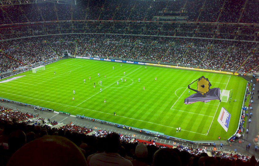 The @premierleague new season kicks off today! For you football (soccer) and astrophysics fans, did you know that #NASAWebb fills nearly half of the penalty box, and the Webb primary mirror is over 2.5 times taller than the goal? ⚽ For more on Webb, see: https://jwst.nasa.gov pic.twitter.com/Myqk16FDQv