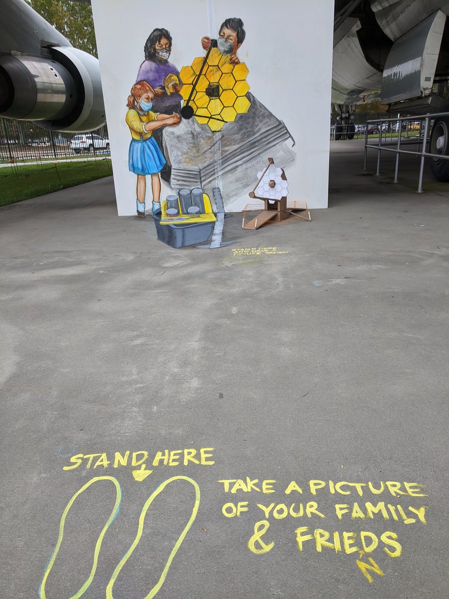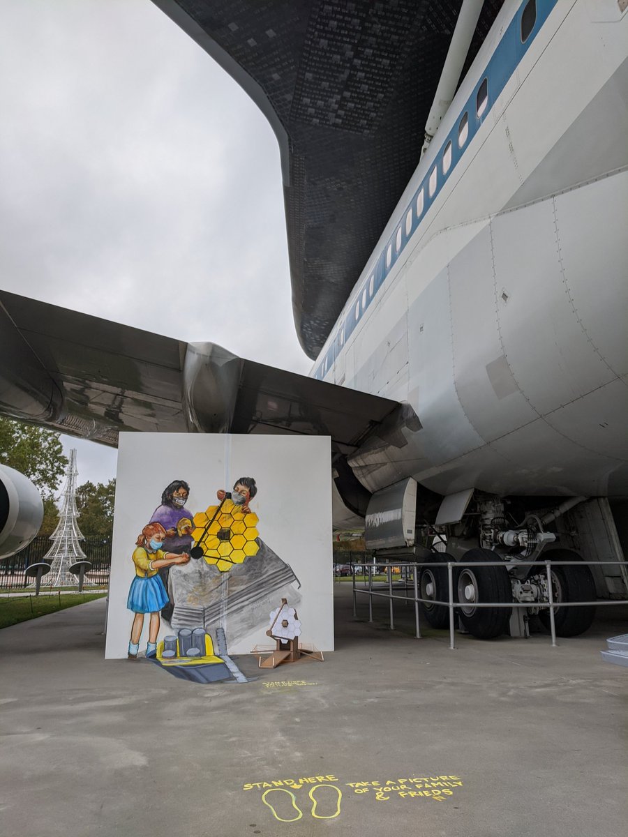 This artist's homage to the James Webb Space Telescope next to the Space Shuttle Carrier Aircraft is so 2020 with figures even wearing masks, but also hopeful what new knowledge this successor to the Hubble might bring. @SpaceCenterHou.pic.twitter.com/NVFaZfnvPt