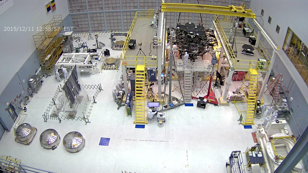 Webbcam: at back left are 2 uncovered mirror segments; #6 is on the assembly stand. http://www.jwst.nasa.gov/webcam.html #JWSTpic.twitter.com/HISmL4c3o1
