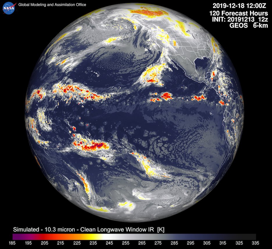 @NOAASatellites GOES-15 this morning at 12:00Z compared with the 5-day forecast from the@NASA GEOS 6km global forecast model running at the@NASA_NCCS. High-resolution, non-hydrostatic dynamics, & advanced physics produce realistic simulations of global#cloudspic.twitter.com/CtNFMBK2tU