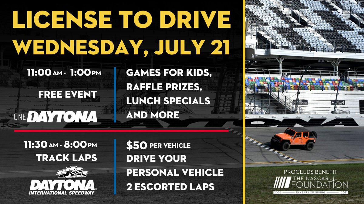 @DAYTONA is now! The@NASCAR_FDN is hosting the first ever License to Drive event on July 21 allowing YOU to drive your personal vehicle around the track for only a $50 dollar donation. Register now: https://nas.cr/DRIVE pic.twitter.com/gBm41g78J0