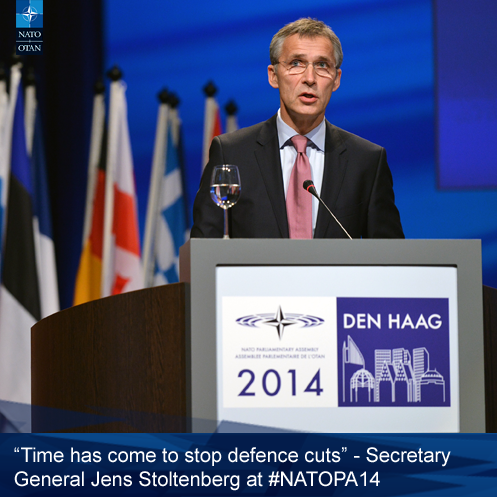 Correct RT @NATO: "Time has come to stop defence cuts" NATO SG @jensstoltenberg at #NATOPA14 http://goo.gl/Go5NQ8 pic.twitter.com/OReNTiLBDy