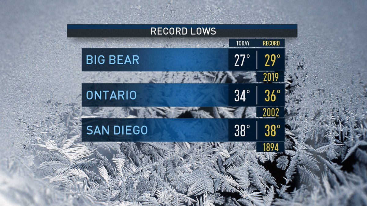 A few record low temperatures this morning with a big WOW in San Diego. 38° this morning tying a record from 1894! The last time San Diego was in the 30s was 2013.