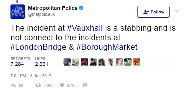 UPDATE: The incident at London's Vauxhall area is a stabbing unrelated to the incidents at London Bridge and Borough Market, Met Police saypic.twitter.com/yk7Rf2R1iy