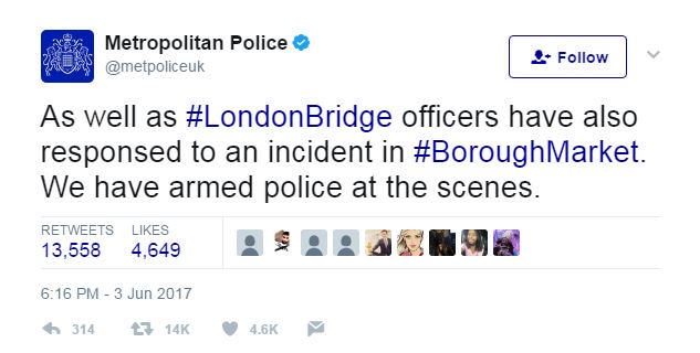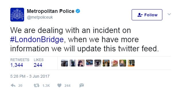BREAKING: U.K. Metropolitan police tweet that they are dealing with an incident on the London Bridgepic.twitter.com/AErOK2WzEA