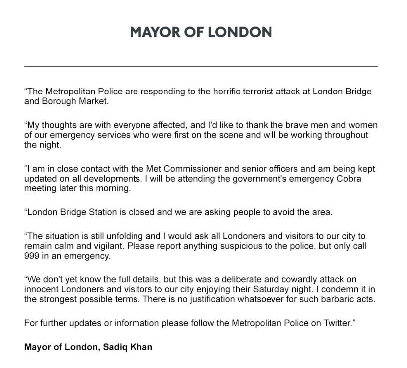 JUST IN: London Mayor Sadiq Khan releases statement on attack at London Bridge and Borough Marketpic.twitter.com/KTyfJVNOT0