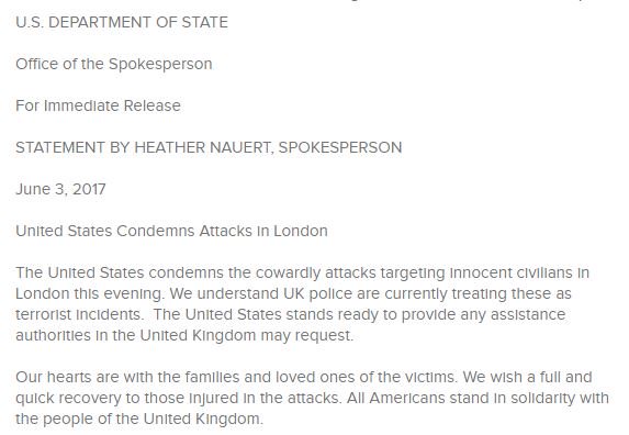 The U.S. condemns London attacks in a statement released by the State Departmentpic.twitter.com/4xWOsn1SCH