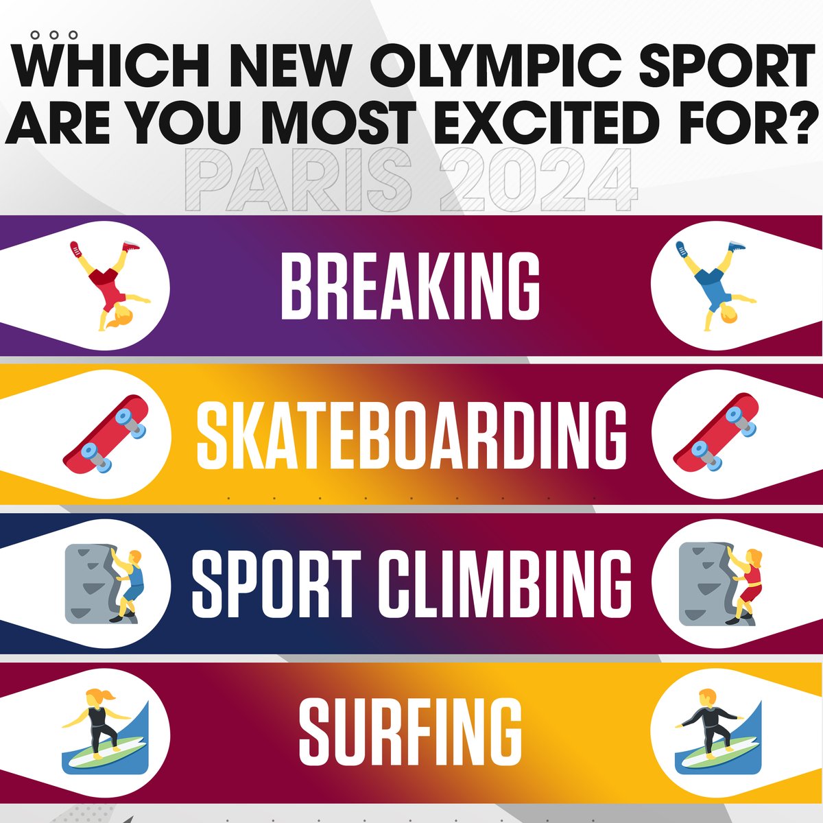 new sports have been added to the @Paris2024 Olympic Games! Drop the emoji of the sport you are most excited for