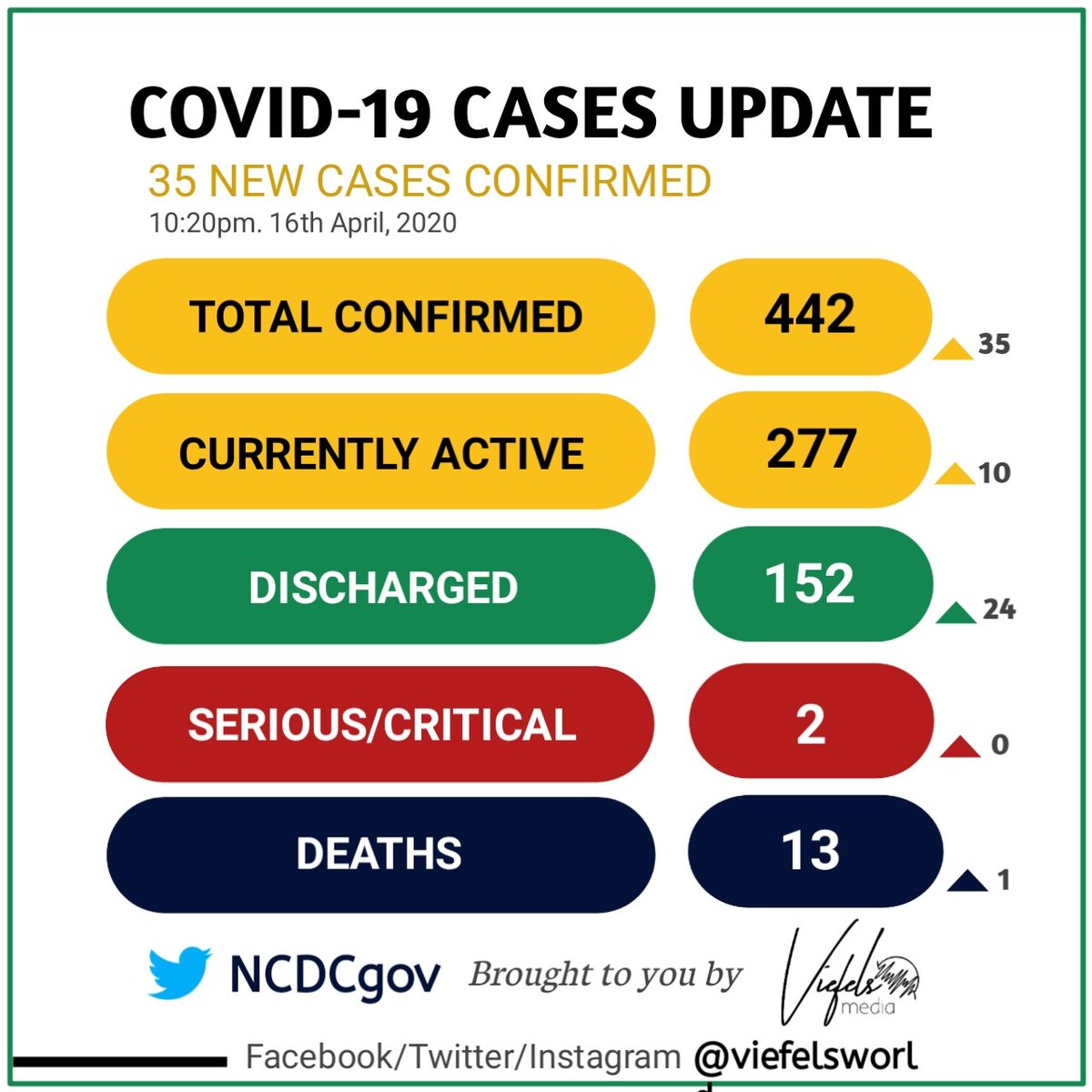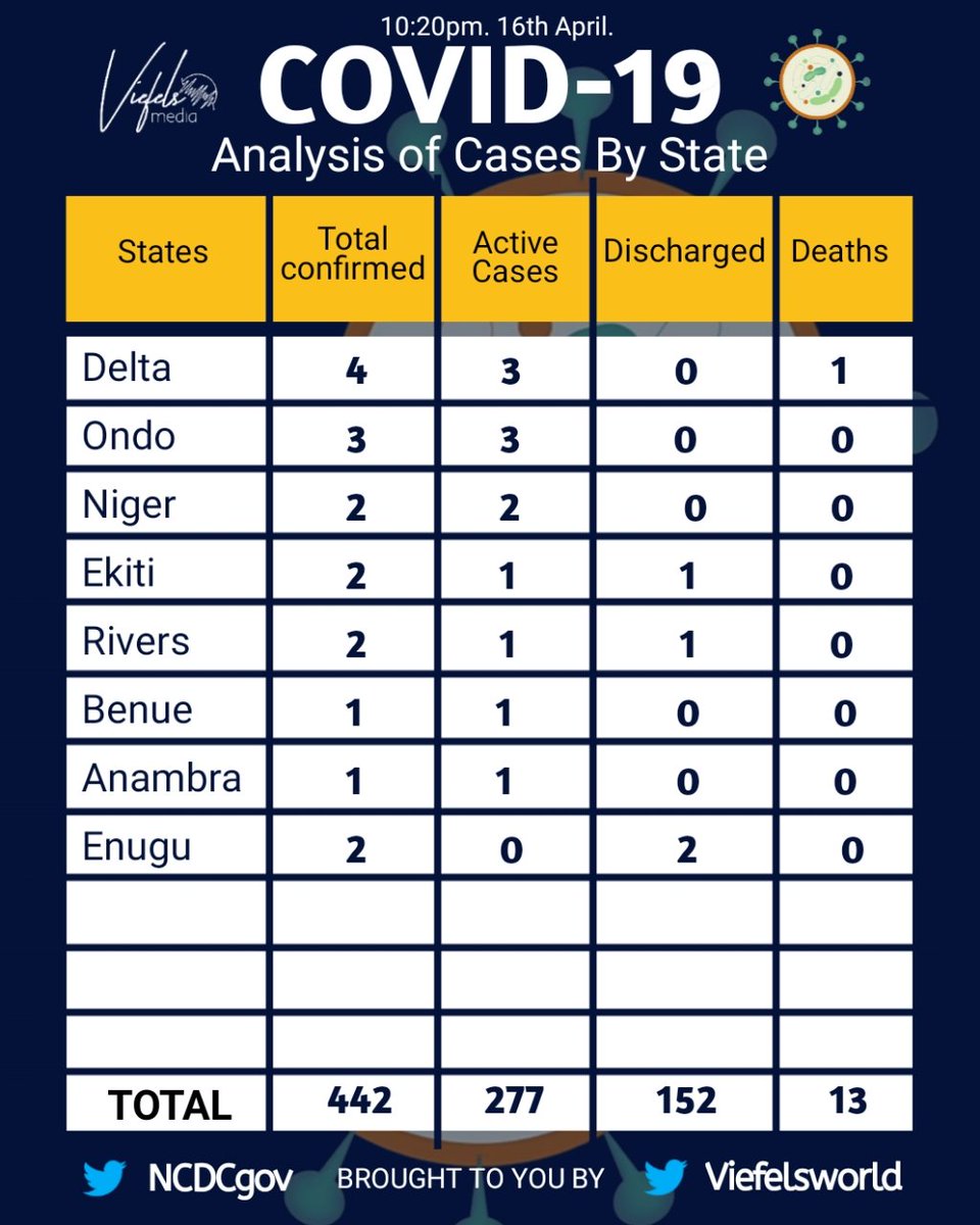 As at 10:20 pm 16th April, number of states with confirmed cases of #COVID19: 19 + FCT