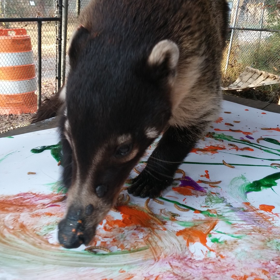 Macano Coatimundi wants to perfect his painting skills this year, as his resolution. Macano gets daily enrichment, as a means of keeping him stimulated and engaged and exercising his species-typical behaviors. He loves to push around the paint. #2020