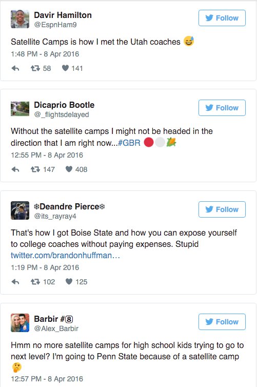 SB✯Nation CFB @SBNationCFBPlayers liked satellite camps, so of course the NCAA's banned them http://www.sbnation.com/college-football/2016/4/9/11395238/ncaa-satellite-camp-rule-change-reaction … pic.twitter.com/entuaJeil30 retweets 1 like -