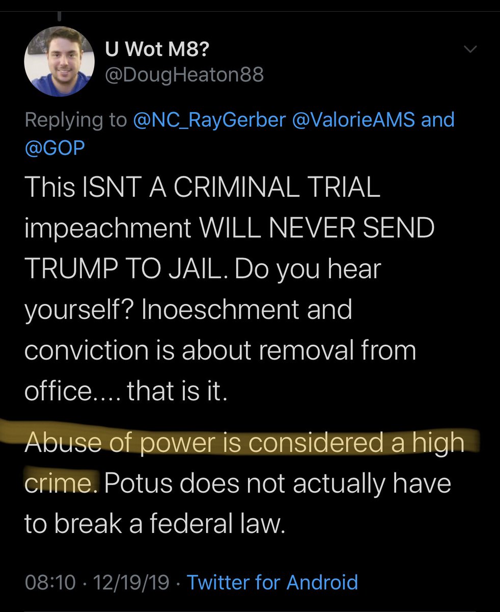 This ISNT A CRIMINAL TRIAL impeachment WILL NEVER SEND TRUMP TO JAIL. Do you hear yourself? Inoeschment and conviction is about removal from office.... that is it. Abuse of power is considered a high crime. Potus does not actually have to break a federal law.
