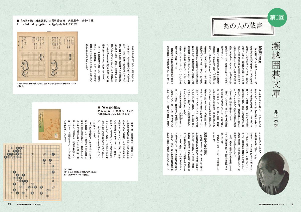 <NDL月報2月号> シリーズ「あの人の蔵書」第2回は、呉清源の師としても知られる囲碁棋士・瀬越憲作のコレクションの中から棋譜や指南書を紹介します。(誤字があったため再度ツイートしています) https://www.ndl.go.jp/jp/publication/geppo/index.html …pic.twitter.com/fD7JP3iP2m