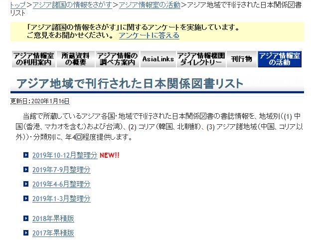 #リサーチ・ナビ に「アジア地域で刊行された日本関係図書リスト」2019年10月-12月整理分を掲載しました。 https://rnavi.ndl.go.jp/asia/entry/bojasia.php …pic.twitter.com/qgJ0nQ81yk