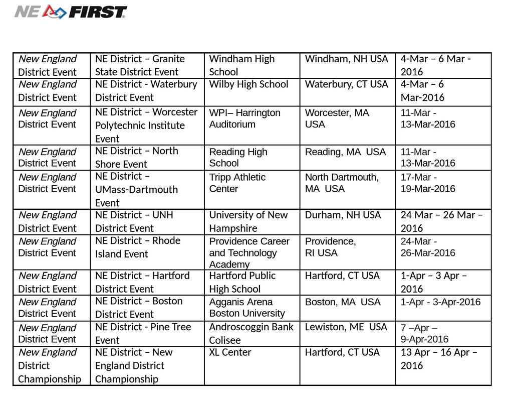 The moment you've all been waiting for, our official 2016 NE FIRST District Event Schedule! #omgtobots #WeAreNEpic.twitter.com/VxBEcxdzbt