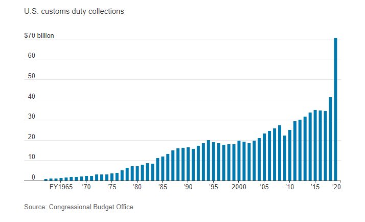 Quite the offset: in FY2019, U.S. tariffs (paid by U.S. companies importing good from China) caused surge in customs duty collections & reduced average real household income by $1,277…