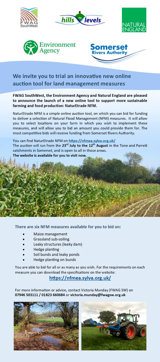 We’re inviting you to be part of a new farmer-driven way of receiving payment for delivering public benefits! New trial for online auction begins on the 23rd July 2018. Take a look here: https://nfmea.sylva.org.uk/ And read more on our website: https://www.fwagsw.org.uk/news/farmers-invited-to-bid-in-somersets-first-online-auction-for-flood-works …