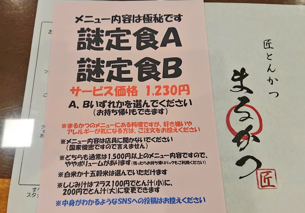 またまた店長の気まぐれ企画の登場です!あなたには「謎定食」をご注文する勇気がありますか?選べるのは、ご覧のようにAかBか、だけです。店長やスタッフに聞いてくださっても内容は国家機密レベルですのでお答えできません。2月6日(木)までの期間限定です!pic.twitter.com/B1C847Q1c4