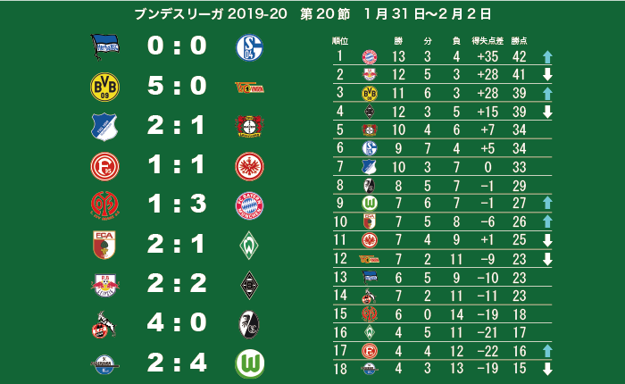 ぐーてんもる元気ですかぁー!ブンデスリーガ第20節の結果をびって