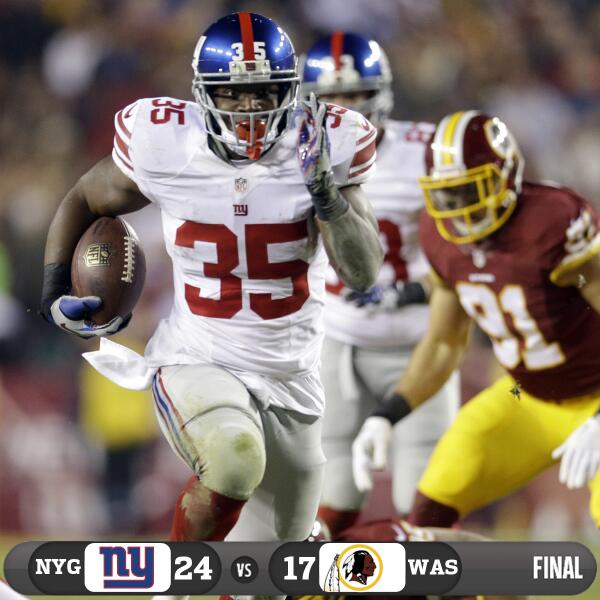 @nfl: FINAL:@Giants 24@Redskins 17#NYGvsWAS pic.twitter.com/nVoG6ku0aI”