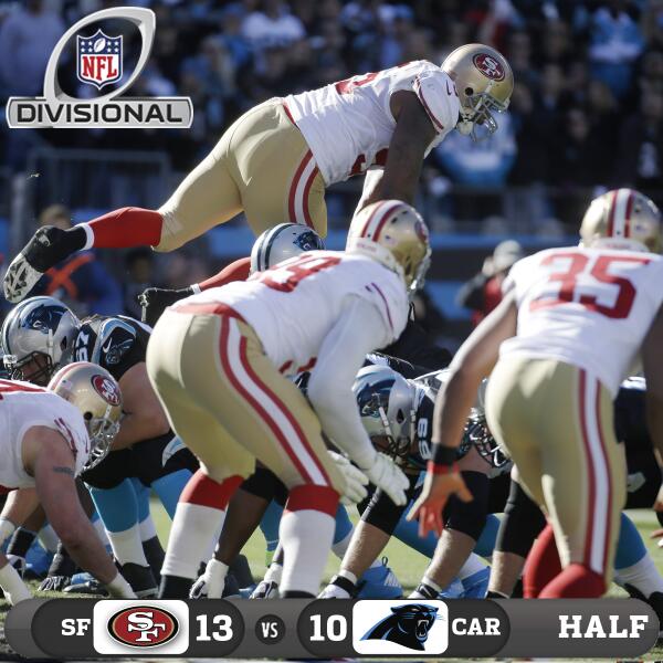 @49ers 13, @Panthers 10 #SFvsCAR #NFLPlayoffs pic.twitter.com/qWy3IxNGBn” i love how thats the picture for the half