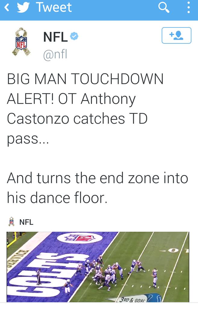 “@nfl:BIG MAN TOUCHDOWN ALERT!OT Anthony Castonzo catches TD pass... And turns the end zone into his dance floor. http://snpy.tv/1qawckE ”Thanks. Twitter will use this to make your timeline better. UndoUndo