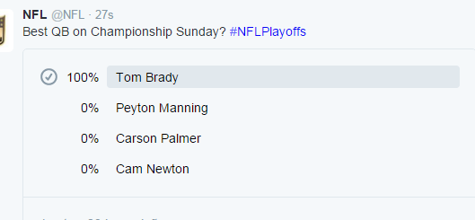 @NFL I'm not a Pats fan....but for Cam to be that close to Brady is just wrong...let's give Cam a few years first and then crown himThanks. Twitter will use this to make your timeline better. UndoUndo