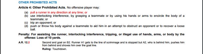 illegal to aid the runner. All the lineman can do is block. That is your rule, the refs need some clinics to learn shit.
