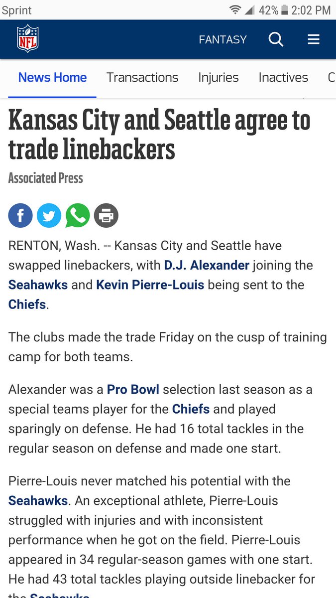 Kansas City and Seattle have swapped linebackers, with D.J. Alexander joining the Seahawks and Kevin Pierre-Louis being sent to the Chiefs.