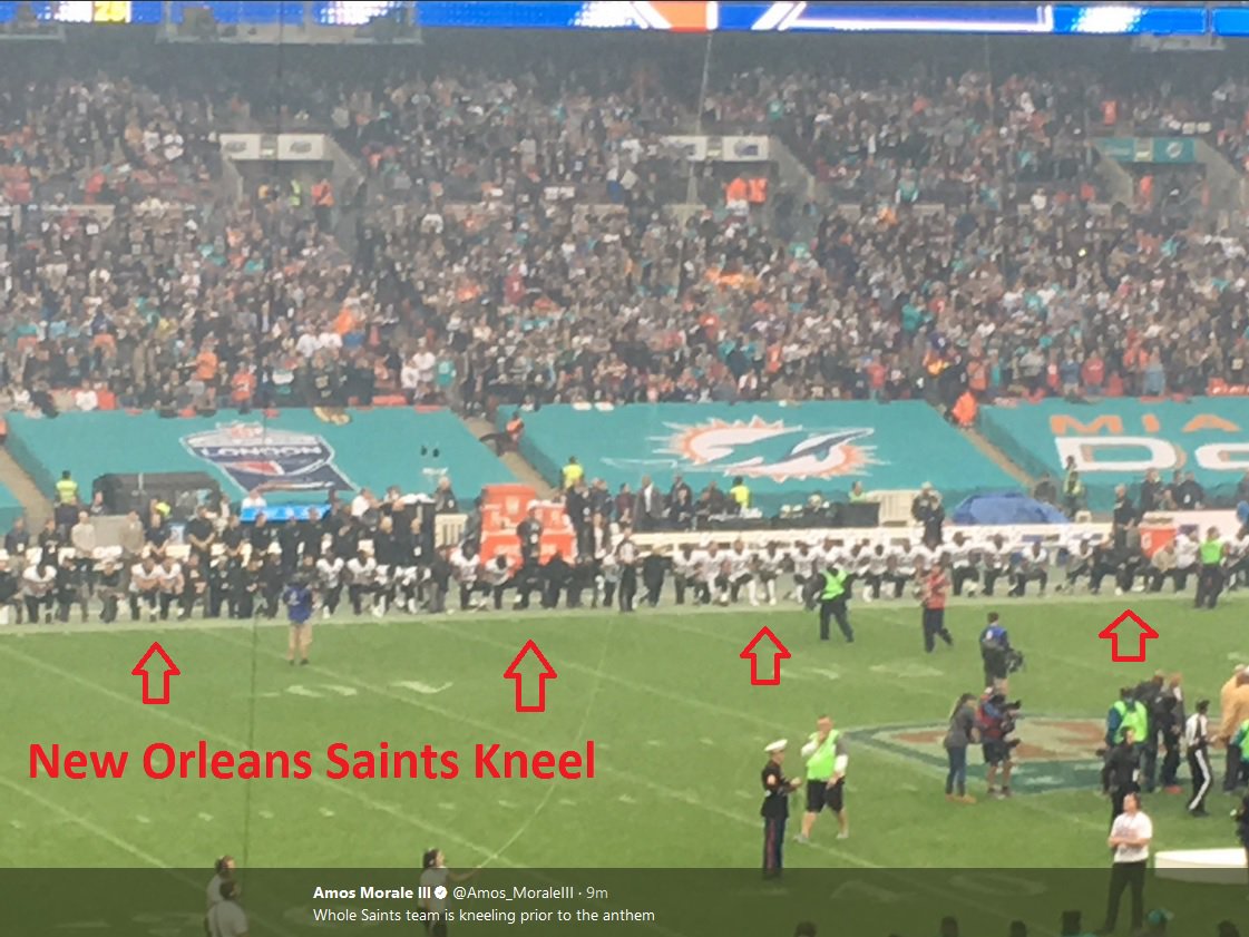 @NFL tried to cover up the@Saints all KNEELING in London by not showing it on@NFLonFOX. Hey NFL, it is 2017, people have smartphones and take pictures!pic.twitter.com/FbpjE7qna8