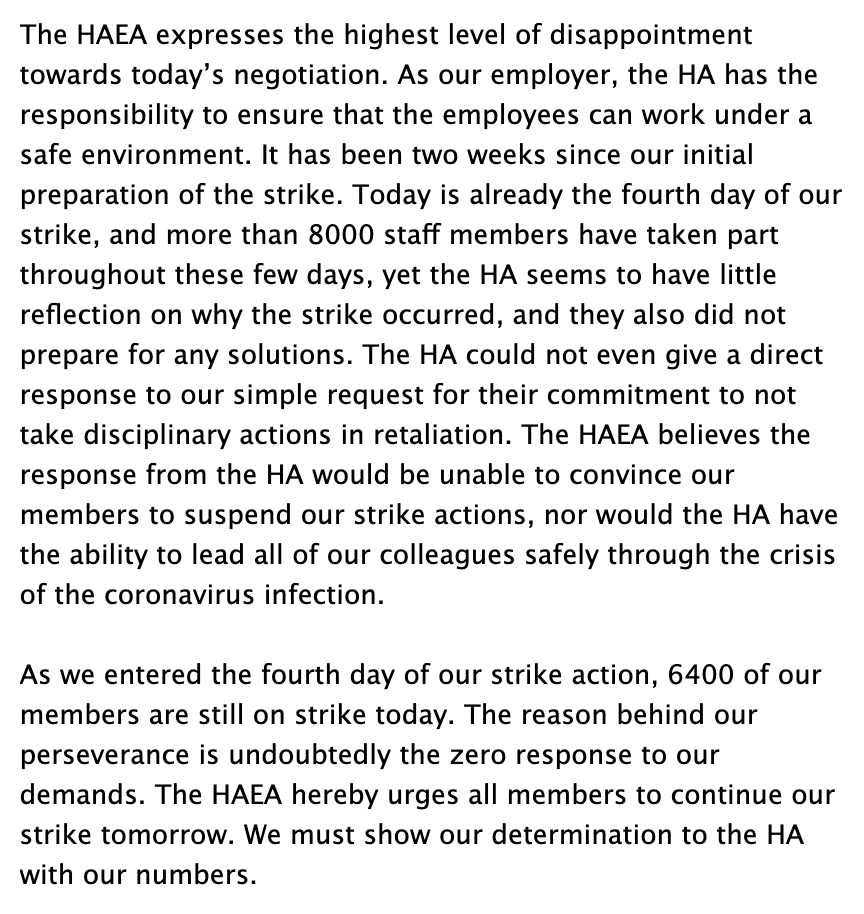 Strike Day 5: Hospital Authority workers currently gathered at HA HQ, holding discussions on the way forward. The strike was initially planned for 5 days w the possibility of extension/escalation. These discussions, held at several locations around